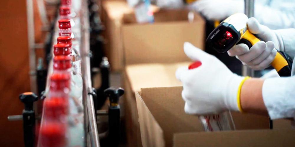 Акцизная марка при помощи этикетировочной машины, или аппликатора этикеток наклеивается на бутылку. Далее, на участке упаковки бутылок в короба, оператор берет бутылку с конвейера, сканирует с нее уникальный Data Matrix код и помещает бутылку в короб.
